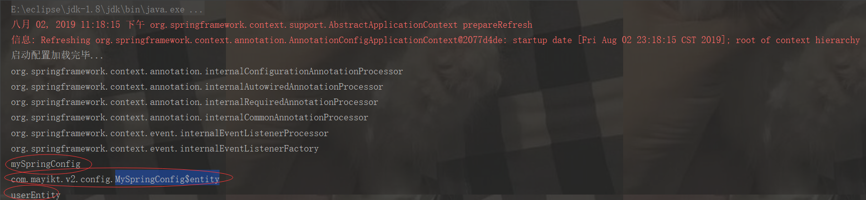 // @Configuration注解的spring容器加载方式,用AnnotationConfigApplicationContext替换ClassPathXmlApplicationContext